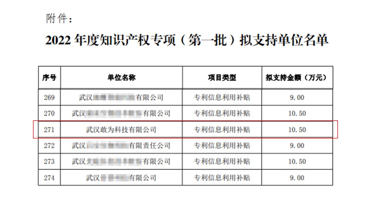 近日,武漢東湖高新區市場監督管理局(知識產權局)發布了《2022 年度知識產權專項(第一批)擬支持單位名單,武漢敢為科技有限公司經申報、初審、第三方審核、復核、征求相關部門意見等程序,獲得專利信息利用補貼10.5萬元。