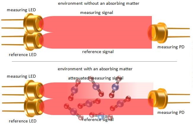 二氧化碳的吸收光譜傳感器通過檢測二氧化碳的吸收峰4.26um附近的吸光度光譜來分析組分濃度,過數學運算將樣品總吸光度對應不同組分濃度的吸光度曲線,每種曲線在不同波段的高度綜合運算反映出實際對應的二氧化碳物質的真實濃度。